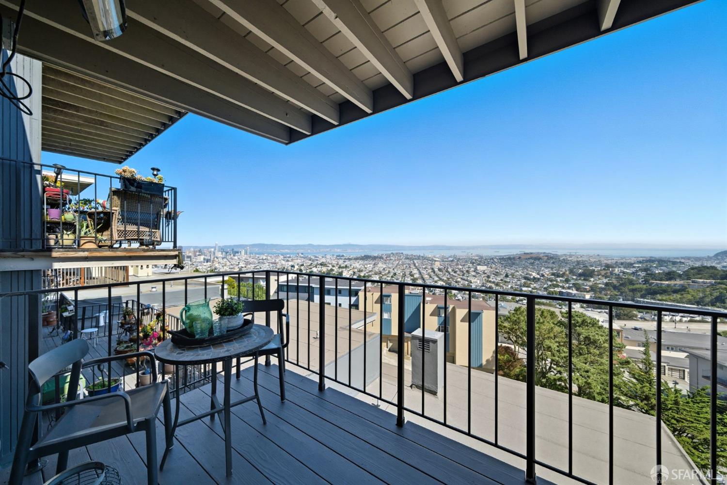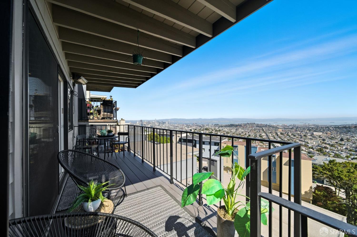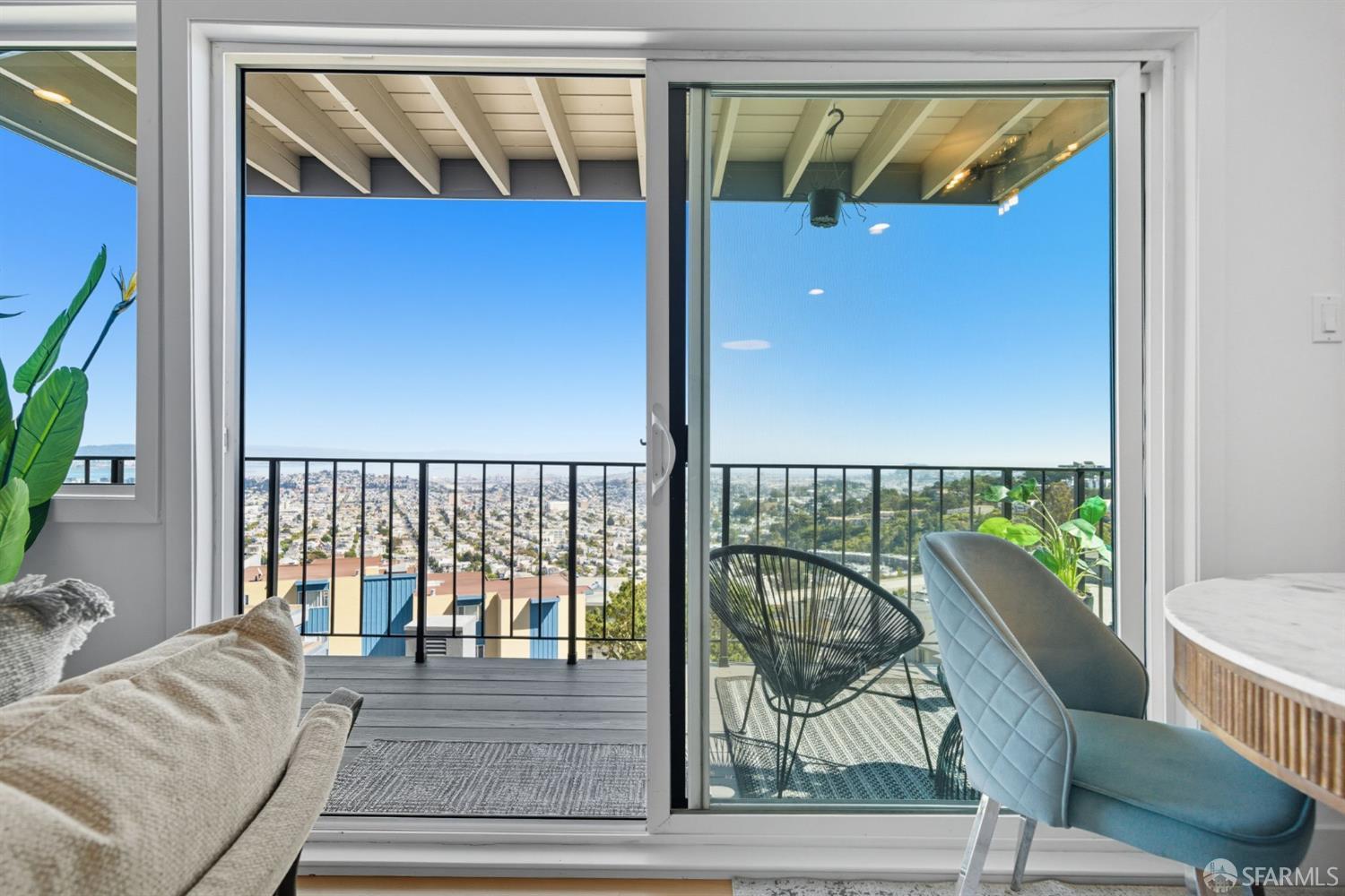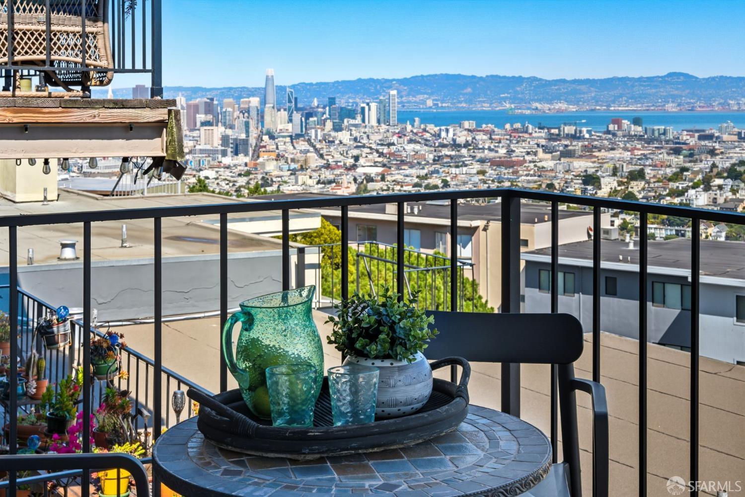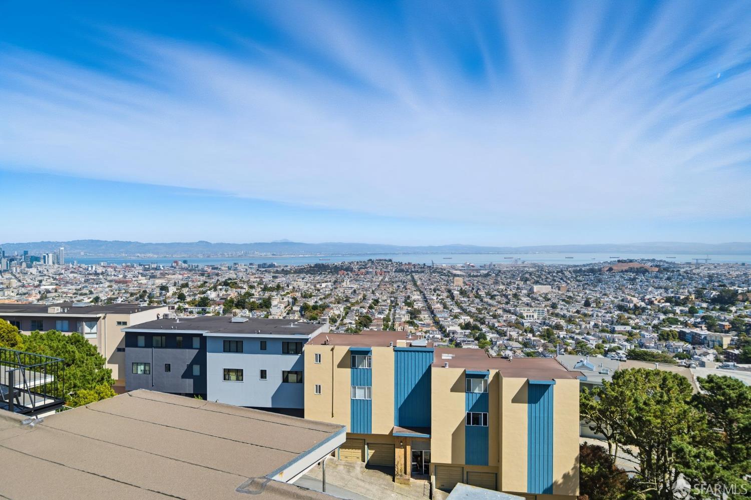 Stunning top-floor 2BR/1BA Twin Peaks residence with panoramic SF skyline and bay views. Renovated home features hardwood floors, skylight, and thoughtful lighting throughout. Expansive living/dining area opens to generous balcony via oversized sliding doors, showcasing unobstructed views from downtown to East Bay and Mount Diablo. Modern kitchen includes terrazzo counters, tile backsplash, and premium stainless appliances. Dedicated office workspace maximizes the vista. Both bedrooms offer ample closet space, hardwood floors, and greenbelt views. Updated bathroom has new vanity, tub/shower, and skylight. In-unit laundry, single-car garage parking and storage complete the home. Prime Twin Peaks location with easy access to Diamond Heights, Noe Valley, West Portal, and Eureka Valley shopping/dining. Convenient MUNI/BART transit and highway access via 101/280. Tenancy in Common in well-maintained 12-unit HOA.