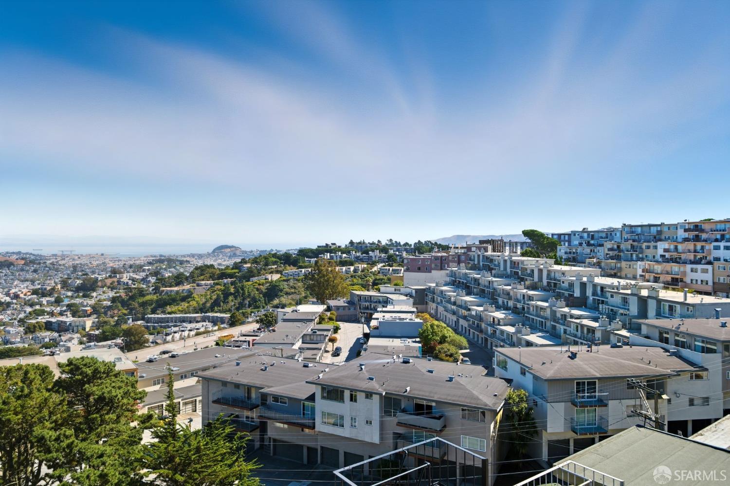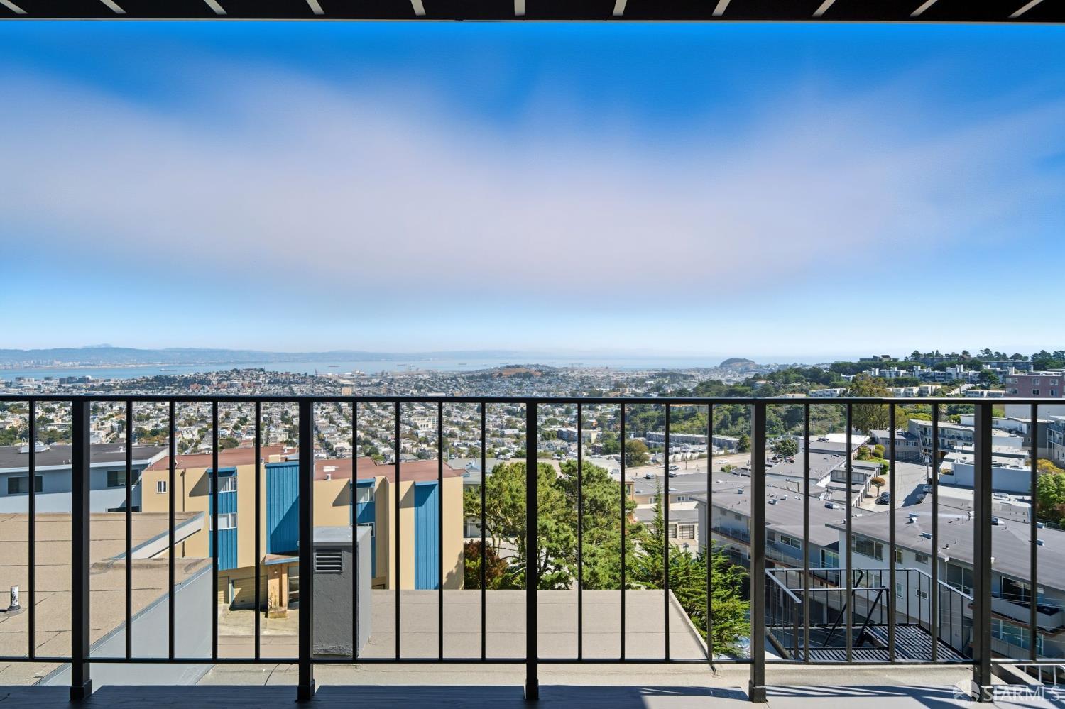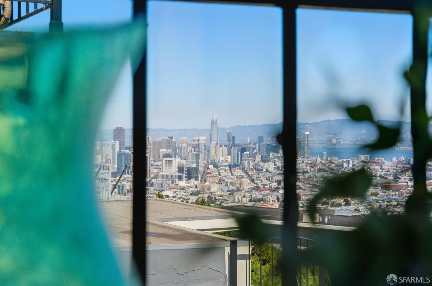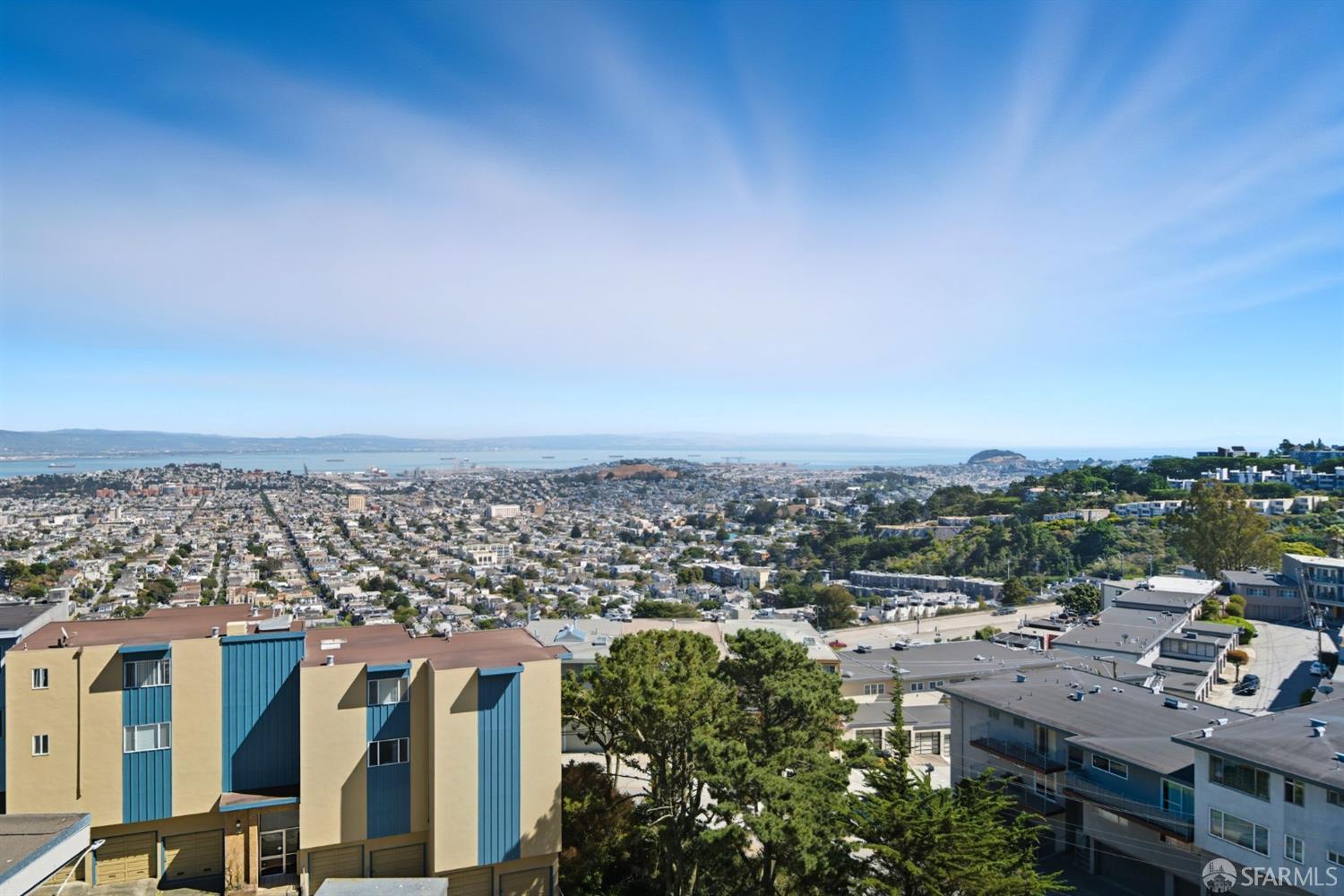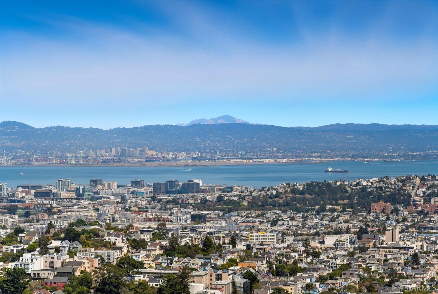 Stunning top-floor 2BR/1BA Twin Peaks residence with panoramic SF skyline and bay views. Renovated home features hardwood floors, skylight, and thoughtful lighting throughout. Expansive living/dining area opens to generous balcony via oversized sliding doors, showcasing unobstructed views from downtown to East Bay and Mount Diablo. Modern kitchen includes terrazzo counters, tile backsplash, and premium stainless appliances. Dedicated office workspace maximizes the vista. Both bedrooms offer ample closet space, hardwood floors, and greenbelt views. Updated bathroom has new vanity, tub/shower, and skylight. In-unit laundry, single-car garage parking and storage complete the home. Prime Twin Peaks location with easy access to Diamond Heights, Noe Valley, West Portal, and Eureka Valley shopping/dining. Convenient MUNI/BART transit and highway access via 101/280. Tenancy in Common in well-maintained 12-unit HOA.