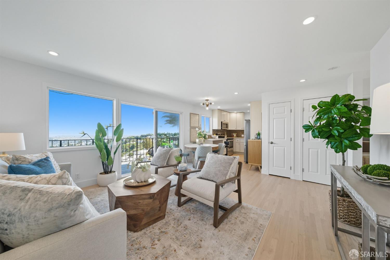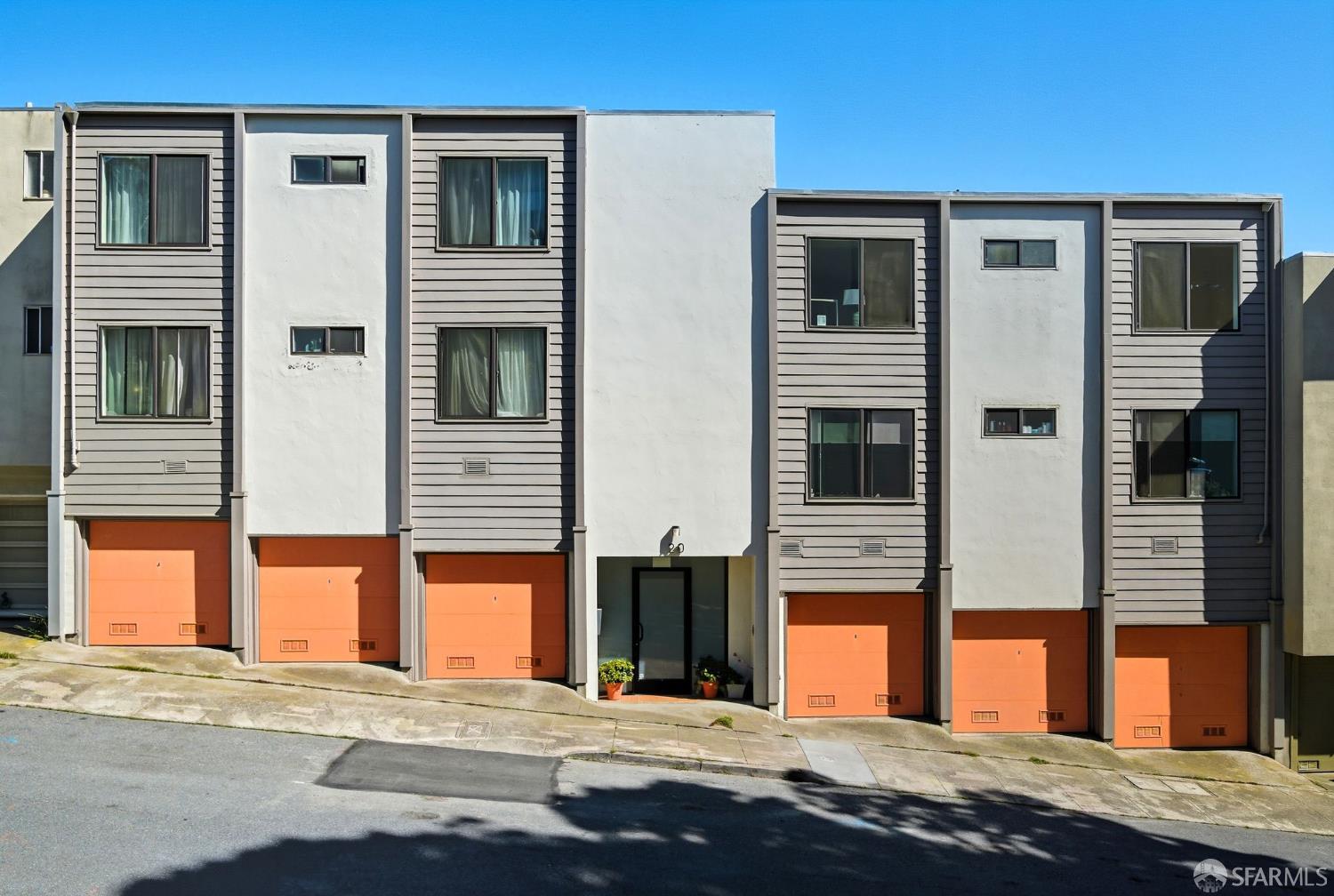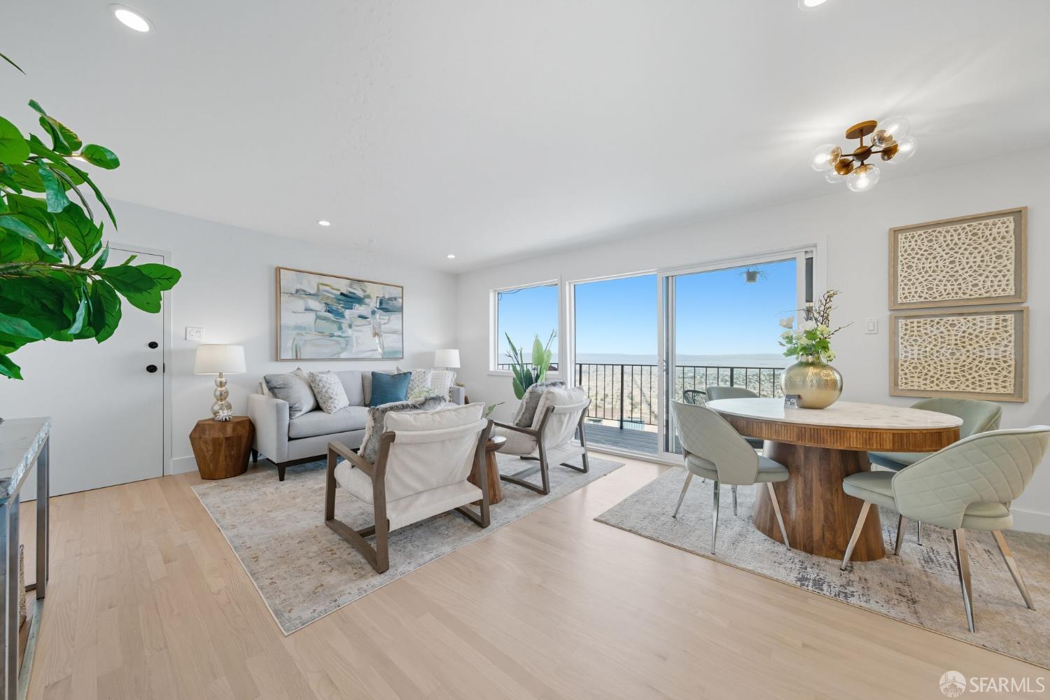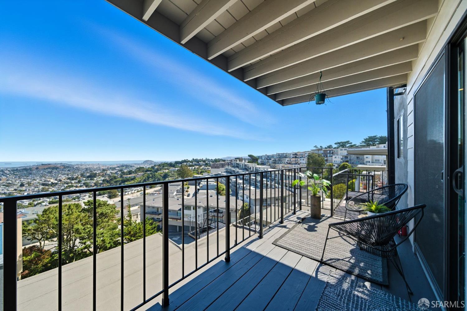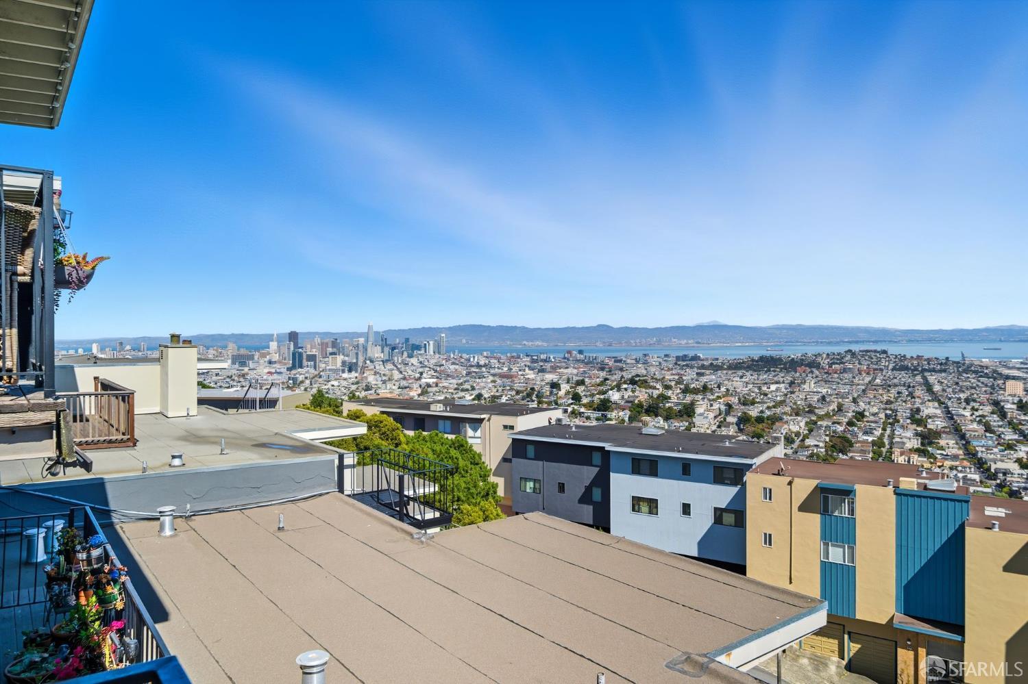 Stunning top-floor 2BR/1BA Twin Peaks residence with panoramic SF skyline and bay views. Renovated home features hardwood floors, skylight, and thoughtful lighting throughout. Expansive living/dining area opens to generous balcony via oversized sliding doors, showcasing unobstructed views from downtown to East Bay and Mount Diablo. Modern kitchen includes terrazzo counters, tile backsplash, and premium stainless appliances. Dedicated office workspace maximizes the vista. Both bedrooms offer ample closet space, hardwood floors, and greenbelt views. Updated bathroom has new vanity, tub/shower, and skylight. In-unit laundry, single-car garage parking and storage complete the home. Prime Twin Peaks location with easy access to Diamond Heights, Noe Valley, West Portal, and Eureka Valley shopping/dining. Convenient MUNI/BART transit and highway access via 101/280. Tenancy in Common in well-maintained 12-unit HOA.