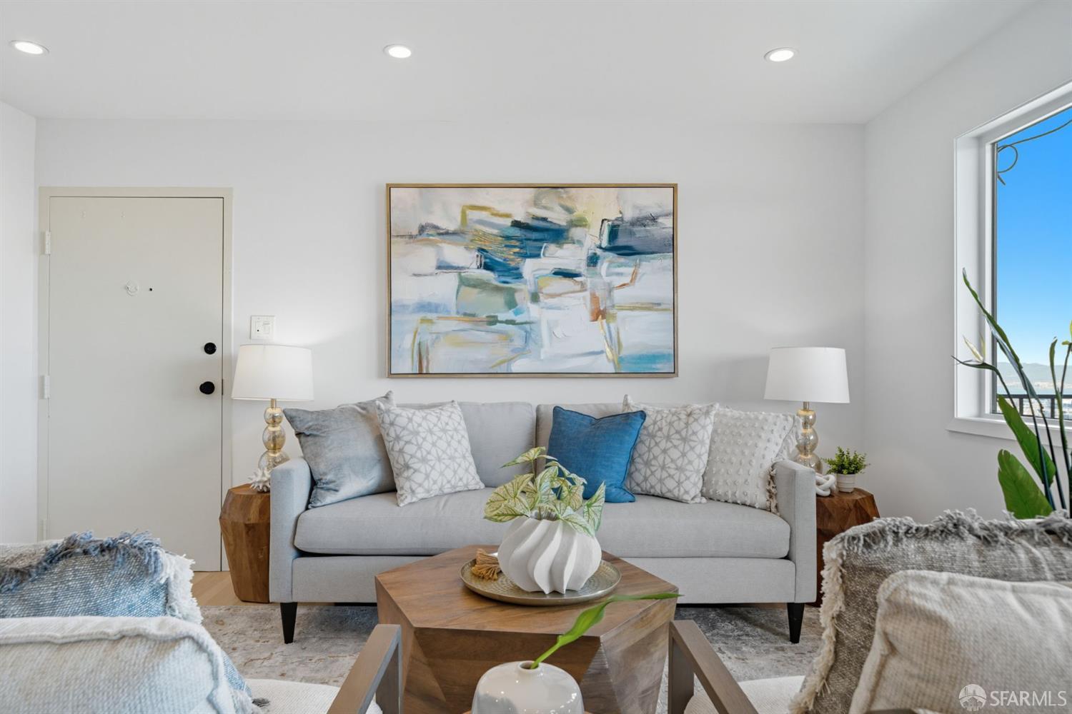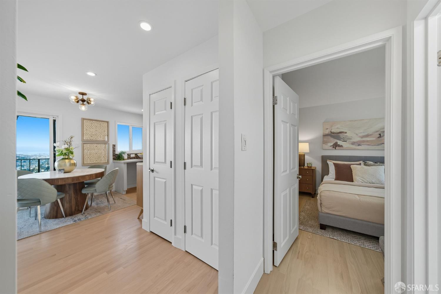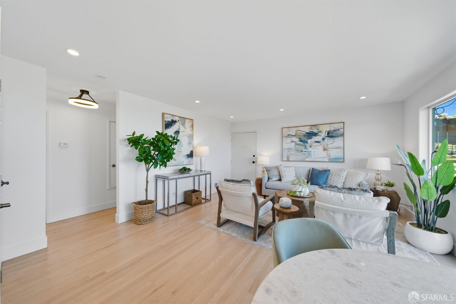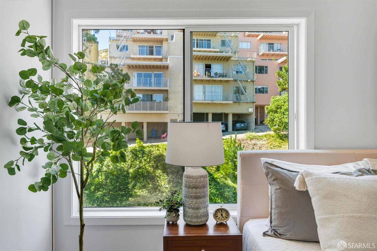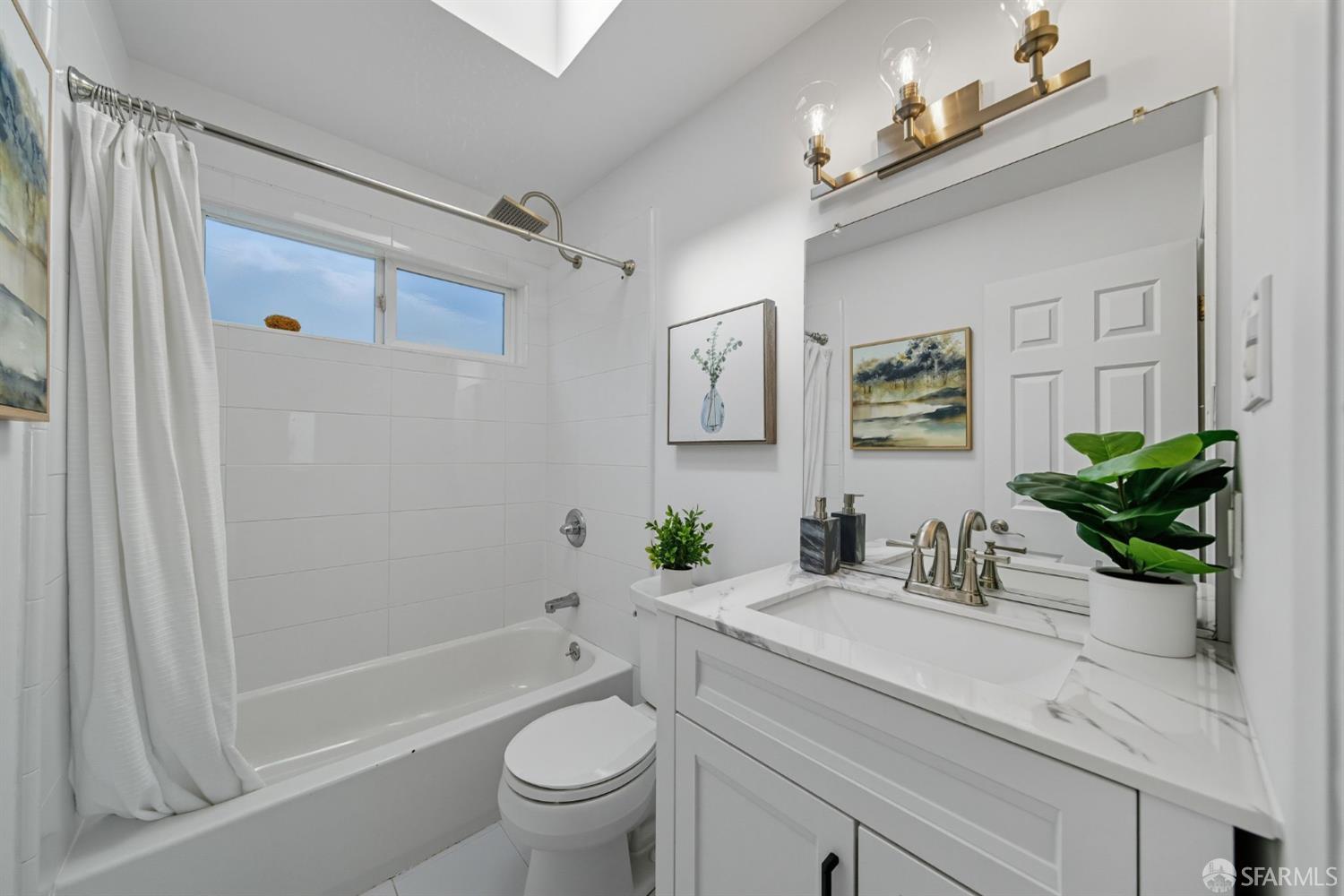 Stunning top-floor 2BR/1BA Twin Peaks residence with panoramic SF skyline and bay views. Renovated home features hardwood floors, skylight, and thoughtful lighting throughout. Expansive living/dining area opens to generous balcony via oversized sliding doors, showcasing unobstructed views from downtown to East Bay and Mount Diablo. Modern kitchen includes terrazzo counters, tile backsplash, and premium stainless appliances. Dedicated office workspace maximizes the vista. Both bedrooms offer ample closet space, hardwood floors, and greenbelt views. Updated bathroom has new vanity, tub/shower, and skylight. In-unit laundry, single-car garage parking and storage complete the home. Prime Twin Peaks location with easy access to Diamond Heights, Noe Valley, West Portal, and Eureka Valley shopping/dining. Convenient MUNI/BART transit and highway access via 101/280. Tenancy in Common in well-maintained 12-unit HOA.