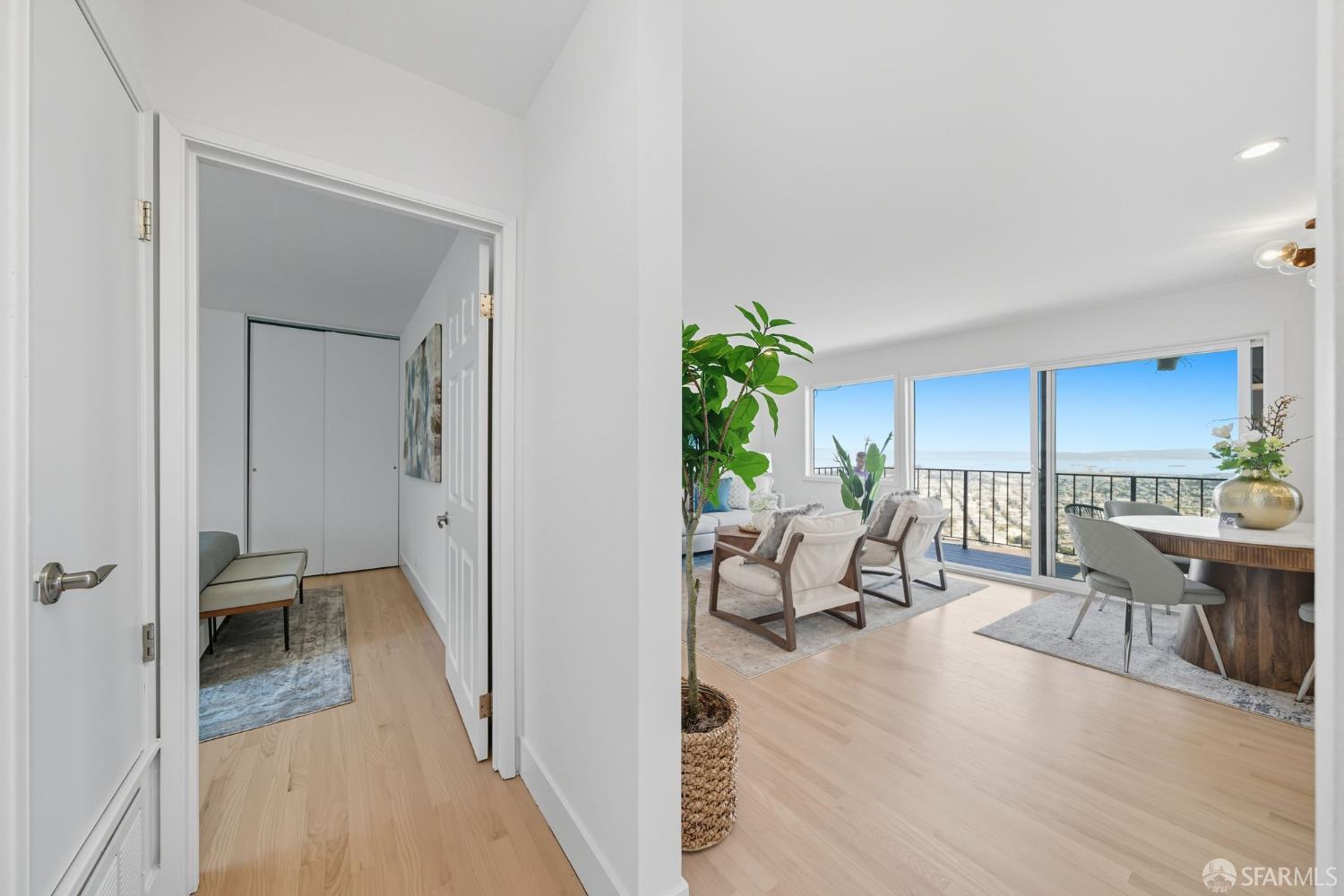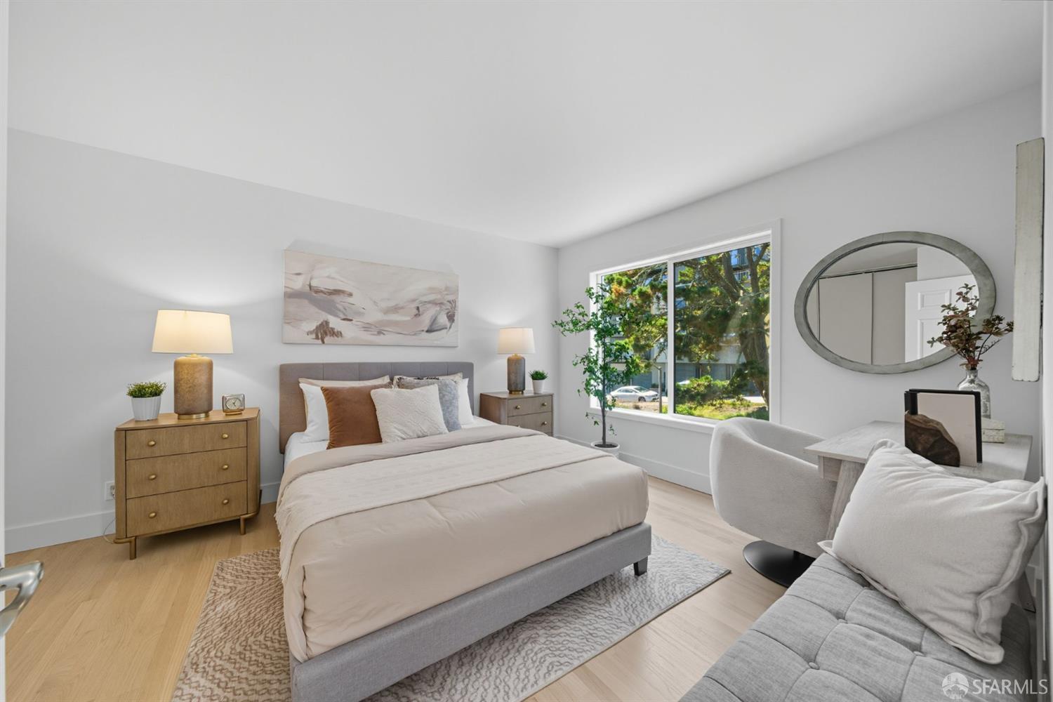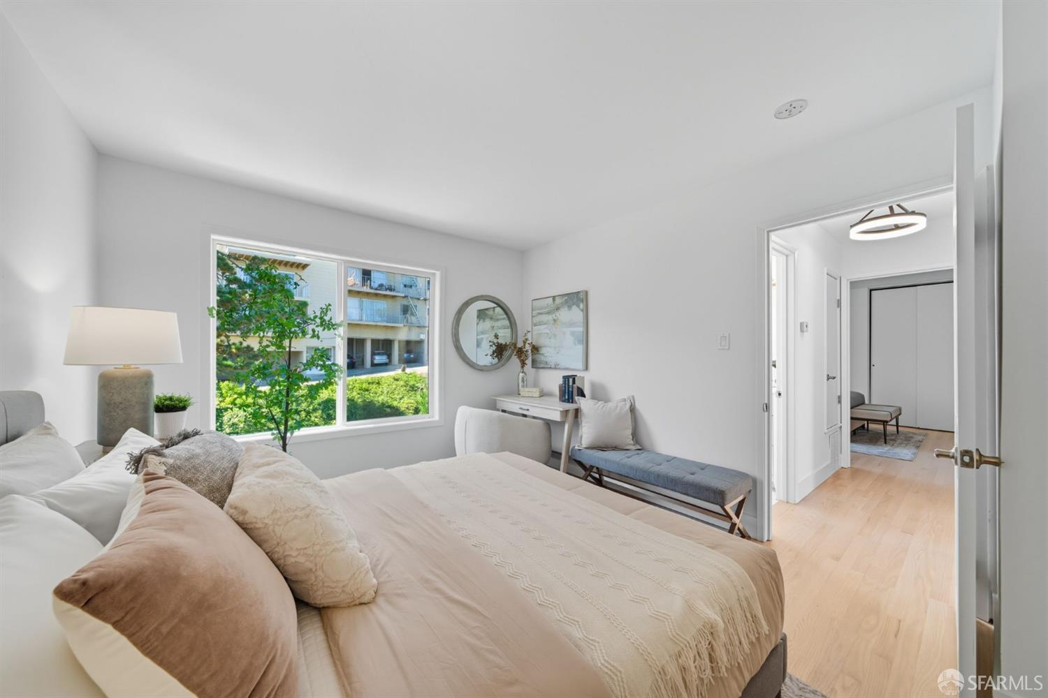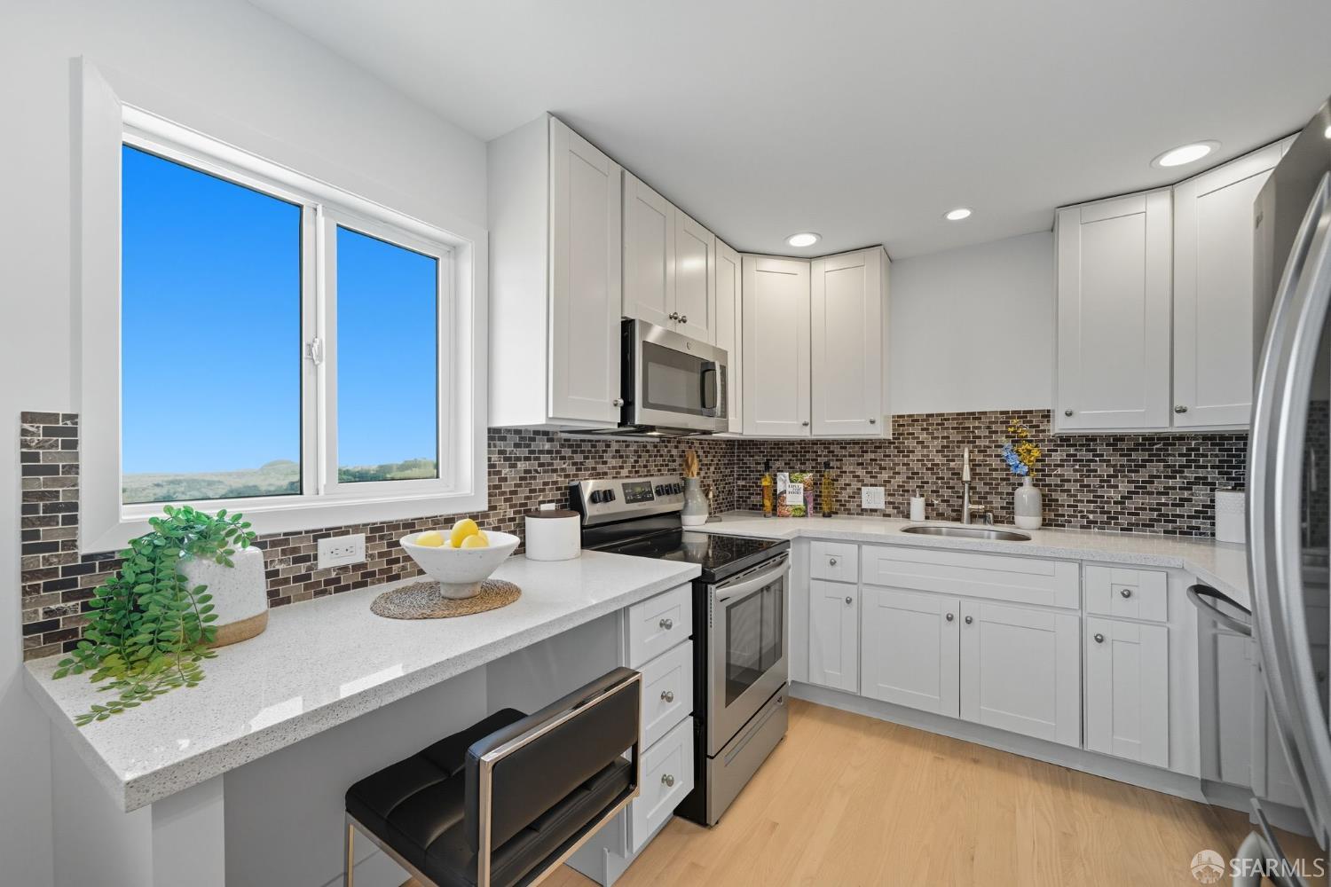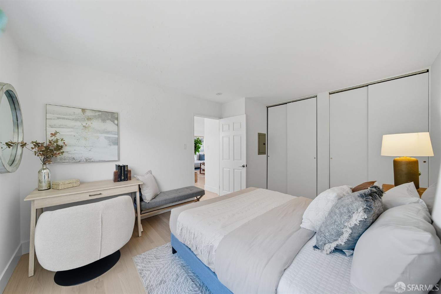 Stunning top-floor 2BR/1BA Twin Peaks residence with panoramic SF skyline and bay views. Renovated home features hardwood floors, skylight, and thoughtful lighting throughout. Expansive living/dining area opens to generous balcony via oversized sliding doors, showcasing unobstructed views from downtown to East Bay and Mount Diablo. Modern kitchen includes terrazzo counters, tile backsplash, and premium stainless appliances. Dedicated office workspace maximizes the vista. Both bedrooms offer ample closet space, hardwood floors, and greenbelt views. Updated bathroom has new vanity, tub/shower, and skylight. In-unit laundry, single-car garage parking and storage complete the home. Prime Twin Peaks location with easy access to Diamond Heights, Noe Valley, West Portal, and Eureka Valley shopping/dining. Convenient MUNI/BART transit and highway access via 101/280. Tenancy in Common in well-maintained 12-unit HOA.