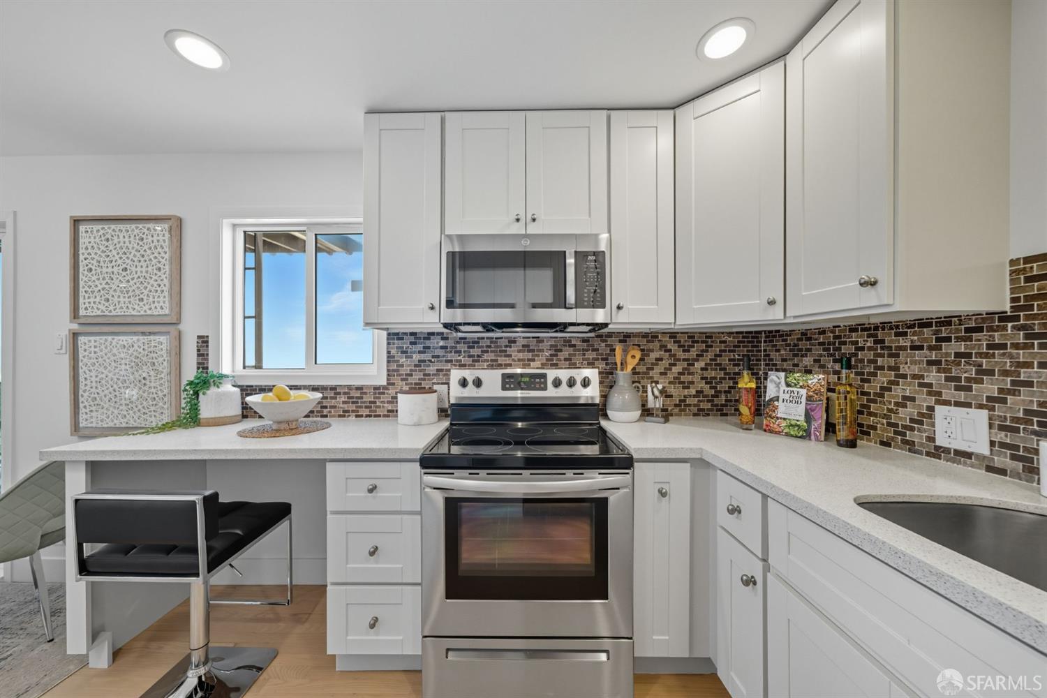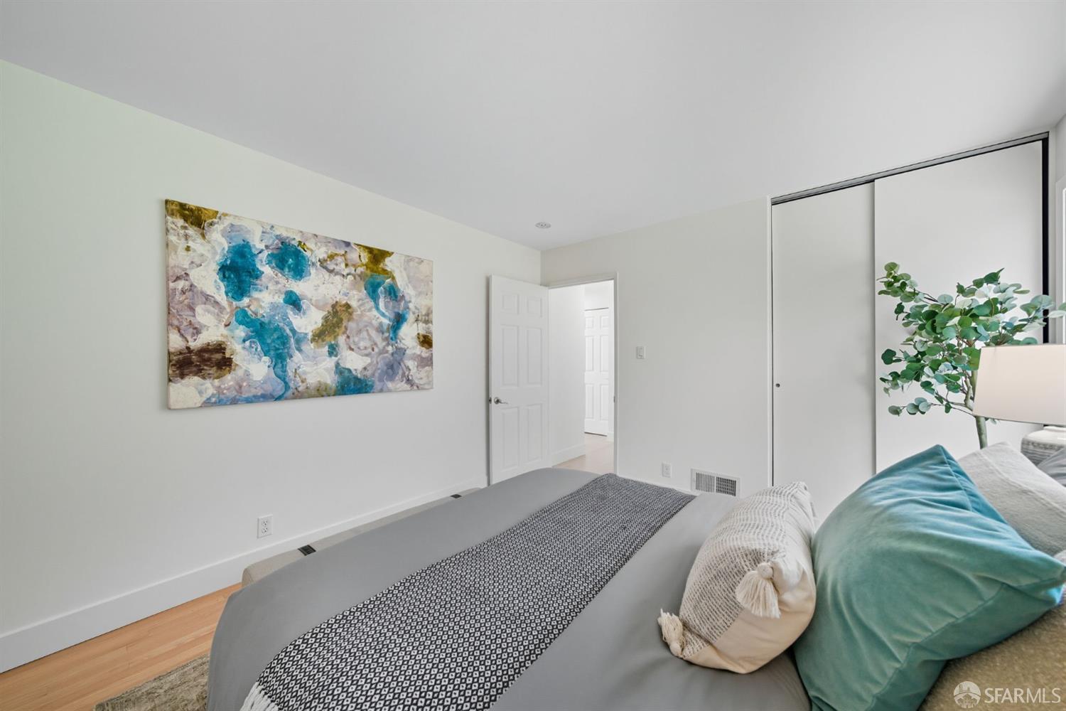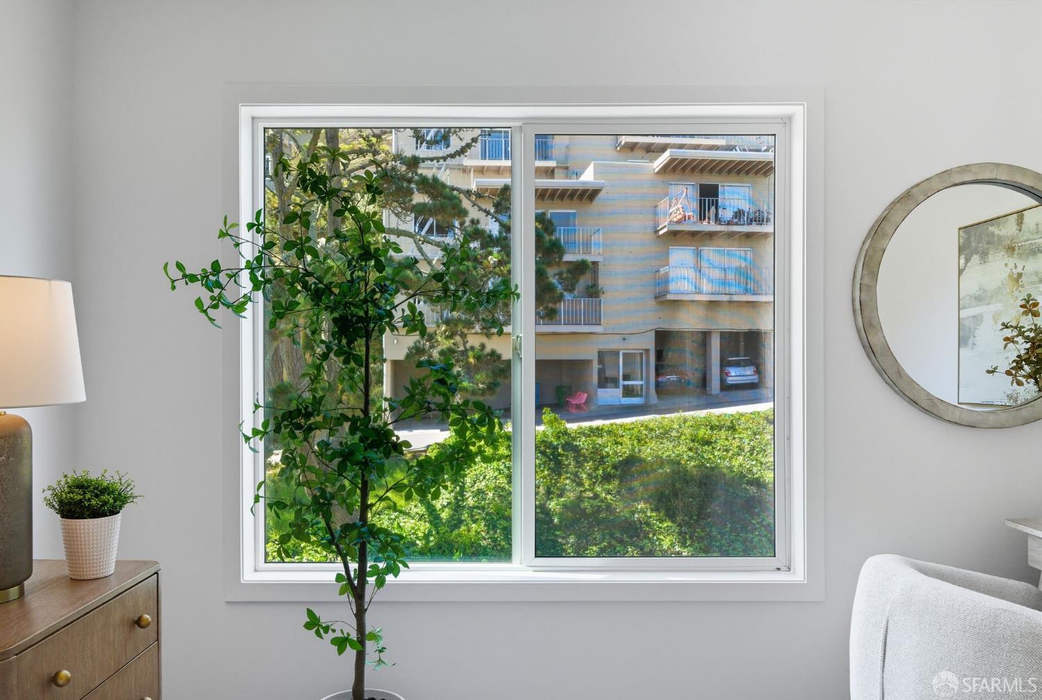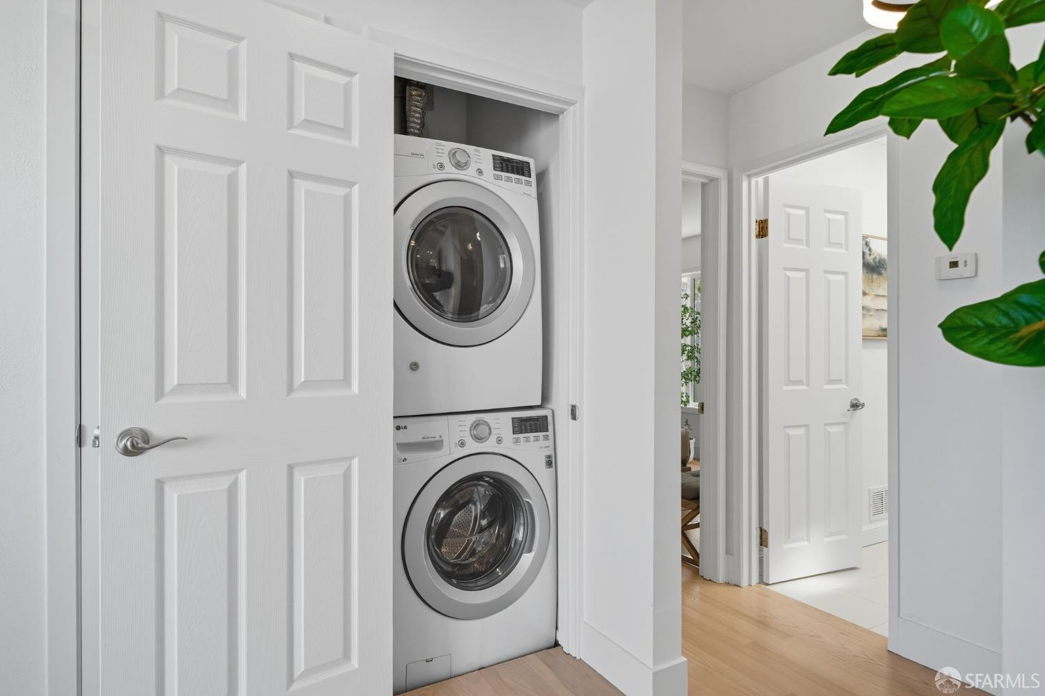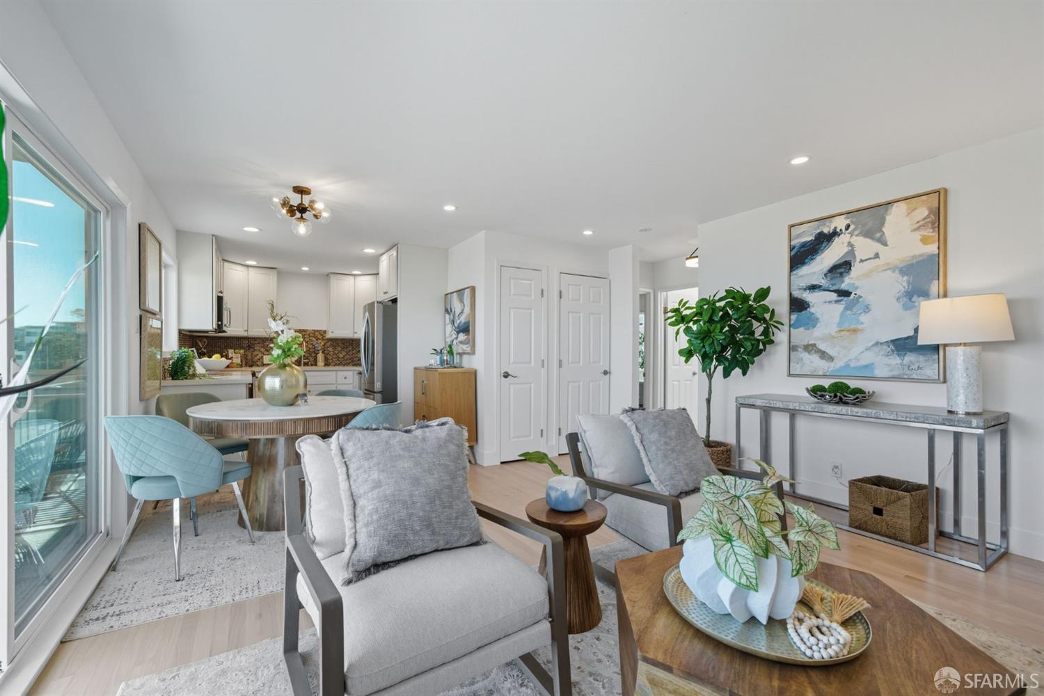 Stunning top-floor 2BR/1BA Twin Peaks residence with panoramic SF skyline and bay views. Renovated home features hardwood floors, skylight, and thoughtful lighting throughout. Expansive living/dining area opens to generous balcony via oversized sliding doors, showcasing unobstructed views from downtown to East Bay and Mount Diablo. Modern kitchen includes terrazzo counters, tile backsplash, and premium stainless appliances. Dedicated office workspace maximizes the vista. Both bedrooms offer ample closet space, hardwood floors, and greenbelt views. Updated bathroom has new vanity, tub/shower, and skylight. In-unit laundry, single-car garage parking and storage complete the home. Prime Twin Peaks location with easy access to Diamond Heights, Noe Valley, West Portal, and Eureka Valley shopping/dining. Convenient MUNI/BART transit and highway access via 101/280. Tenancy in Common in well-maintained 12-unit HOA.
